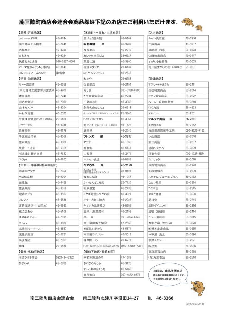 南三陸町商店会連合会商品券は下記のお店でご利用いただけます。