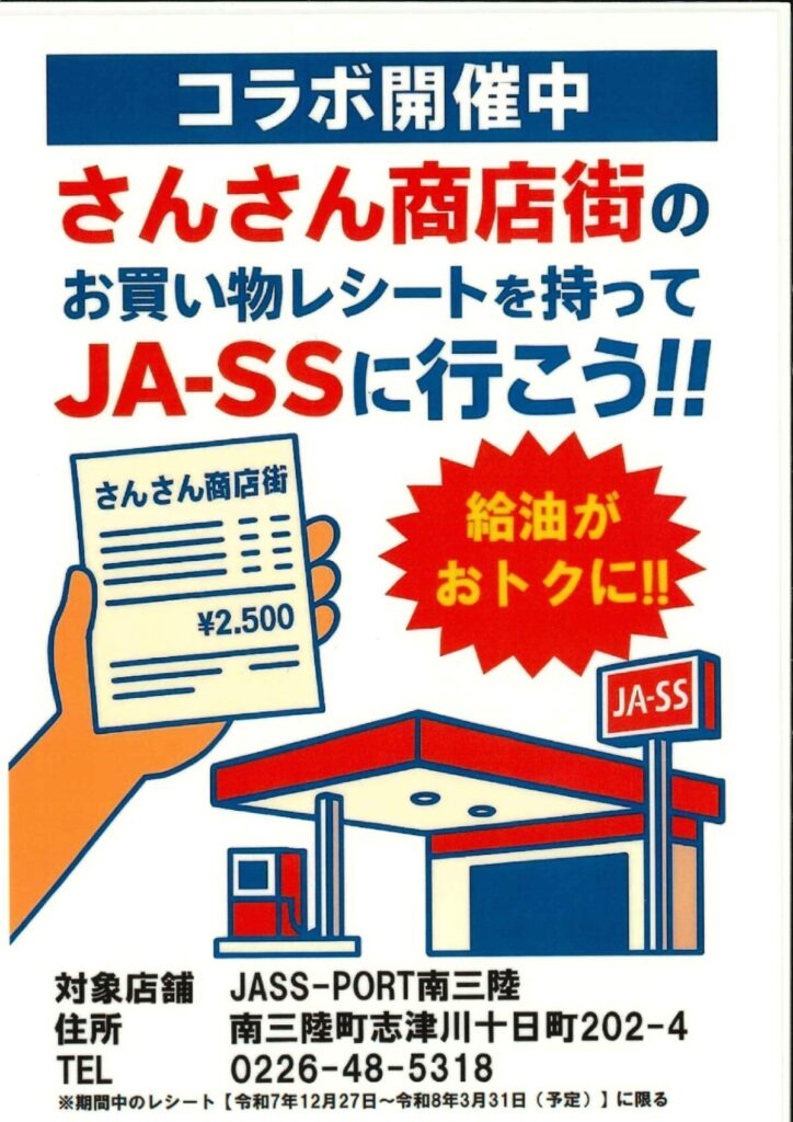 2025年12月27日~2026年3月末日まで!!【JASS-PORT南三陸】期間中にさんさん商店街で購入のレシート持参でガソリン・軽油が割引になるキャンペーンが開催されます!