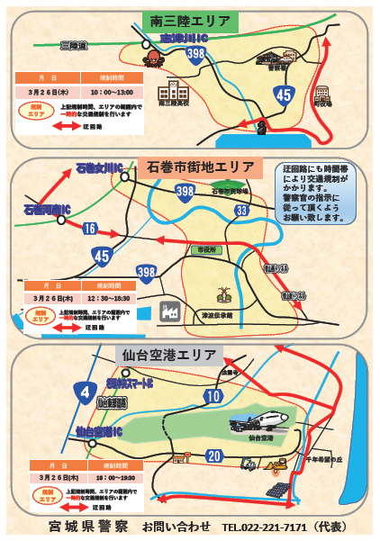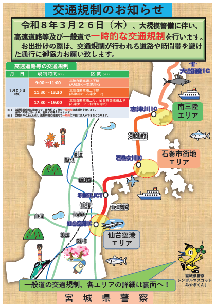 当日は、宮城県警察等による南三陸町内の道路の交通規制が予定されております。当日のお出かけの際は、御注意ください。