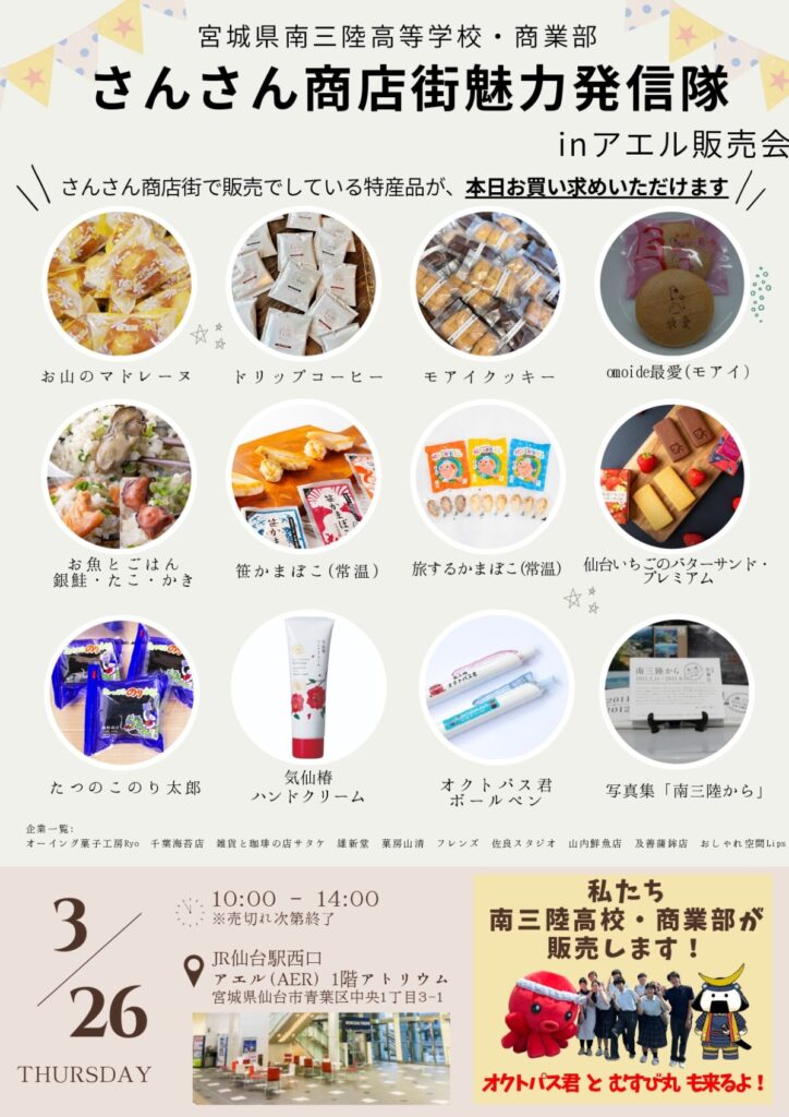 3/26 南三陸高校商業部による「さんさん商店街魅力発信隊IN アエル販売会」が開催されます!