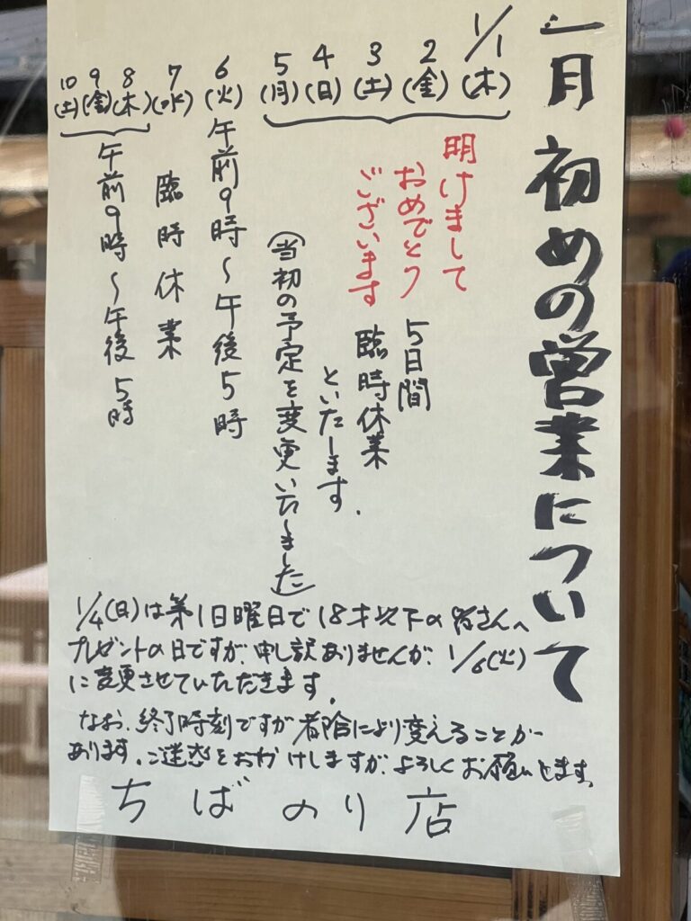 ちばのり店の年始の営業につきまして、下記の通り変更がございますのでお知らせいたします。